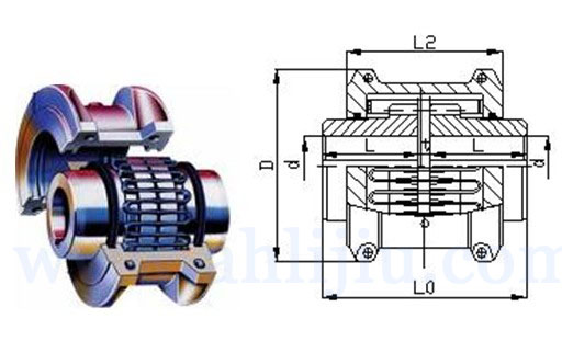| 型號(hào) | 公稱(chēng)轉(zhuǎn)矩 (KN.m) | 許用轉(zhuǎn)速(n) (r/min) | 軸孔直徑 d(mm) | 軸孔長(zhǎng)度 L | 總長(zhǎng)度 L0 | L2 | D | D1 | 間隙 t | 重量 kg | 潤(rùn)滑油 kg | 許用位移量 | ||